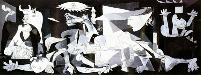 在畢卡索的《格爾尼卡》中,他以畫筆充分的表現出戰爭的殘酷,牛代表強勢暴力的德國納粹,而受傷驚慌的戰馬則代表受難的西班牙人,畫中也能看見來不及逃難、被炸死的無辜百姓,還有在槍林彈雨中,努力為西班牙而戰,但卻手握鮮花戰死的士兵。